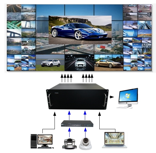 外置拼接解碼處理器(H.265)是專門為同時接入處理網絡攝像機(IPC)和外部源輸入信號(HDMI,DVI,VGA等)而設計,采用最新的專用圖像解碼芯片與FPGA搭配,通過專用圖像解碼芯片解碼網絡攝像機的信號,然后再和通過FPGA接入的外部源輸入信號混合處理,實現圖像切換,拼接,開窗,漫游等功能,是目前解決網絡攝像機